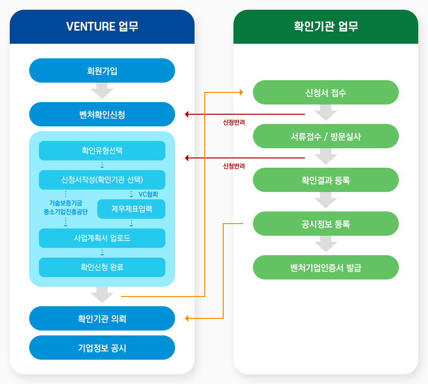 ※ 기술평가보증기관에 벤쳐확인을 신청하였지만 사업성평가를 타기관에 의뢰하였으므로 한국기술거래소 의 평가결과 (사업성평가 우수기업여부, 연구개발기업여부 충족여부)를 확인 후 벤쳐확인서 발급이 가능 하다.